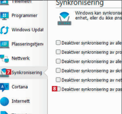 Velg Synkronisering 7. Hvis du ikke vil synkronisere passord, setter du hake ved Deaktiver synkronisering av passord 8.