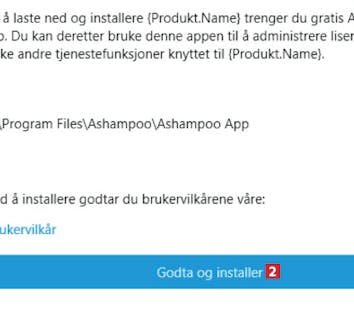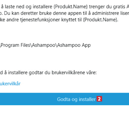 Nå installeres Ashampoo App på maskinen, hvis du ikke har den fra før. Klikk på Godta og installer 2. I neste vindu klikker du på Godta alle.
