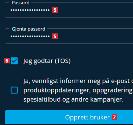 Her oppgir du et passord du velger selv 5. Sett hake ved Jeg godtar (TOS) 6, og klikk på Opprett bruker 7.