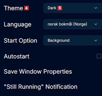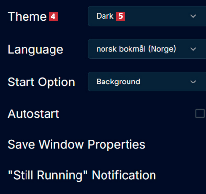 Øverst ved Theme 4 kan du velge mellom mørk og lys brukerflate 5. Her kan du også velge språk, men programmet er ennå ikke oversatt til norsk.