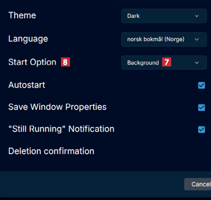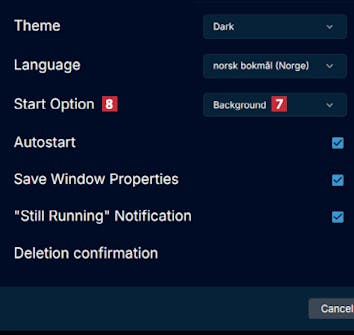 Vi anbefaler at du lar programmet starte og være aktivt i bakgrunnen. Det gjør du ved å velge Background 7 ved Start Option 8. På den måten er det alltid klart til bruk.