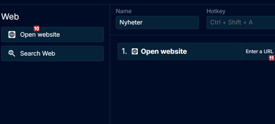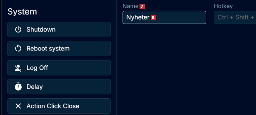 Øverst kan du gi snarveien et navn ved Name 7. Vi kaller snarveien Nyheter 8. Hvis du vil, er det også her du kan endre hurtigtastene, men denne gangen lar vi den være. Også hurtigtastene kan endres på et senere tidspunkt.