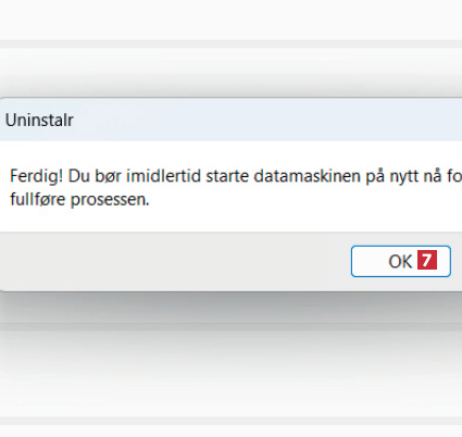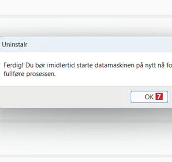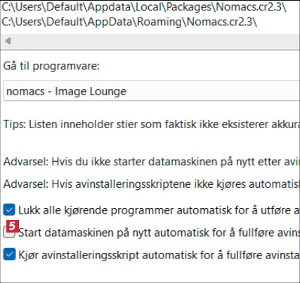 Fjern haken ved Start datamaskinen på nytt automatisk for å fullføre avinstallering 5. Da unngår du at pc-en slår seg av mens du holder på med noe annet.