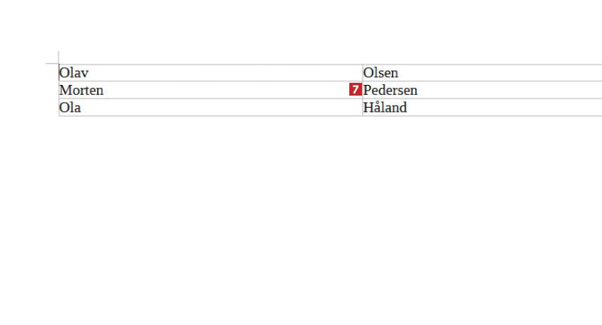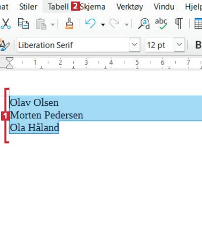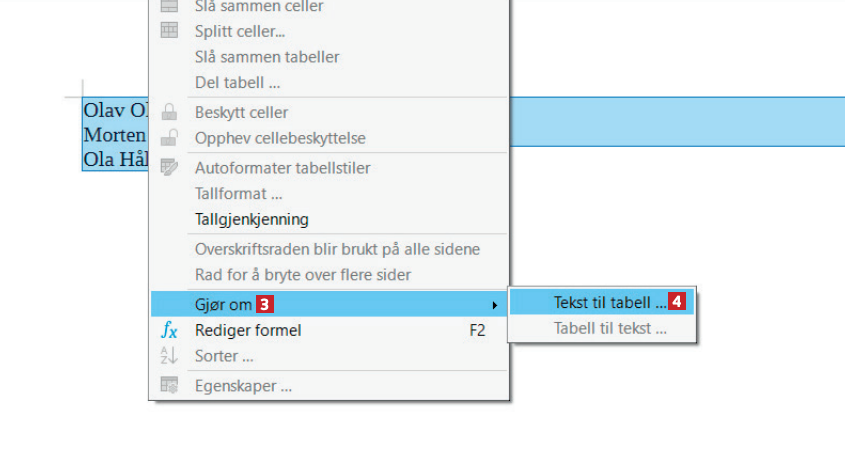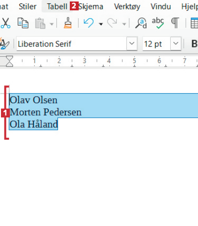 I dokumentet står det tre navn 1 vi vil ha i tabellformat, slik at for- og etternavn står i hver sin kolonne. Klikk på Tabell 2.