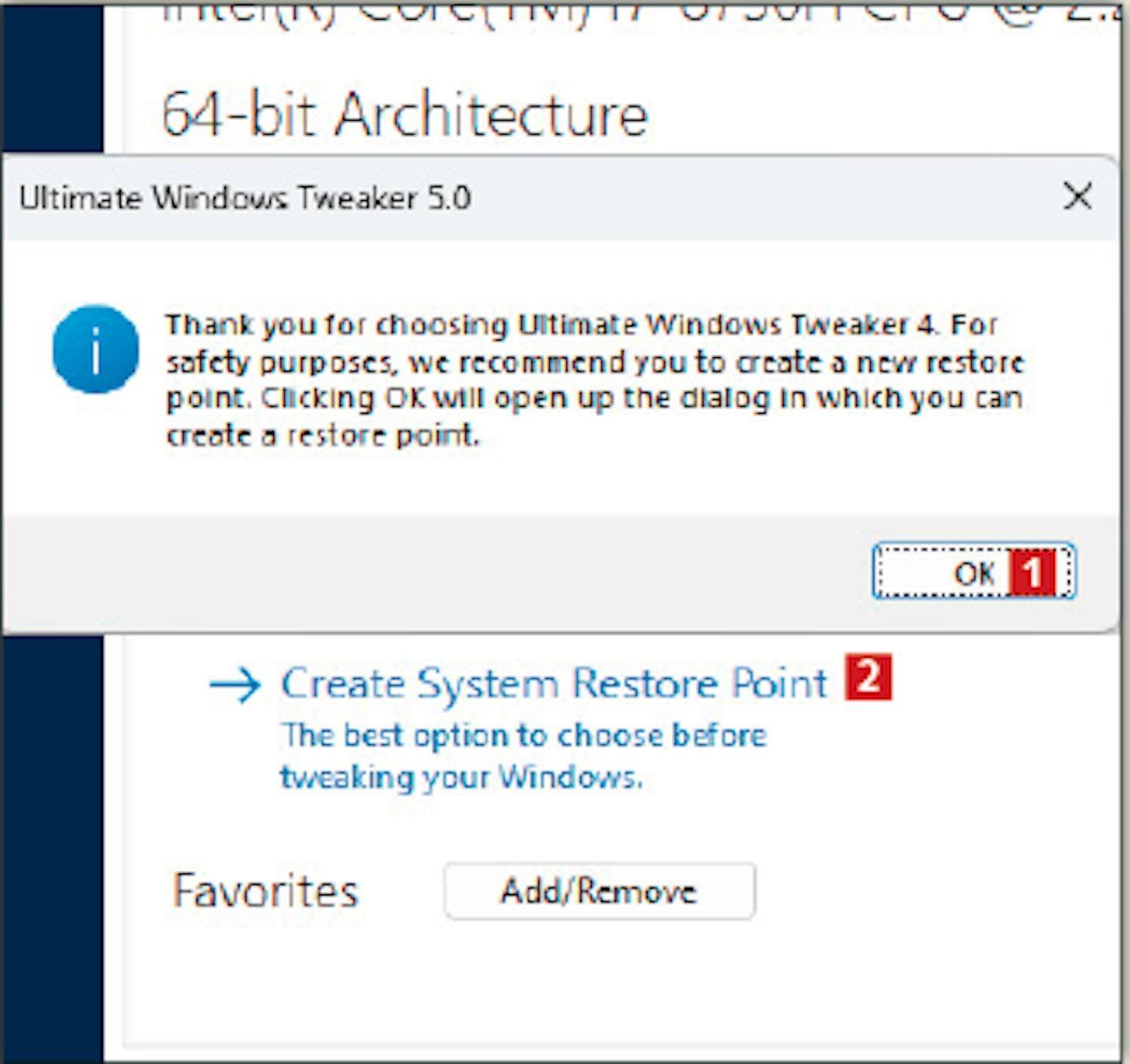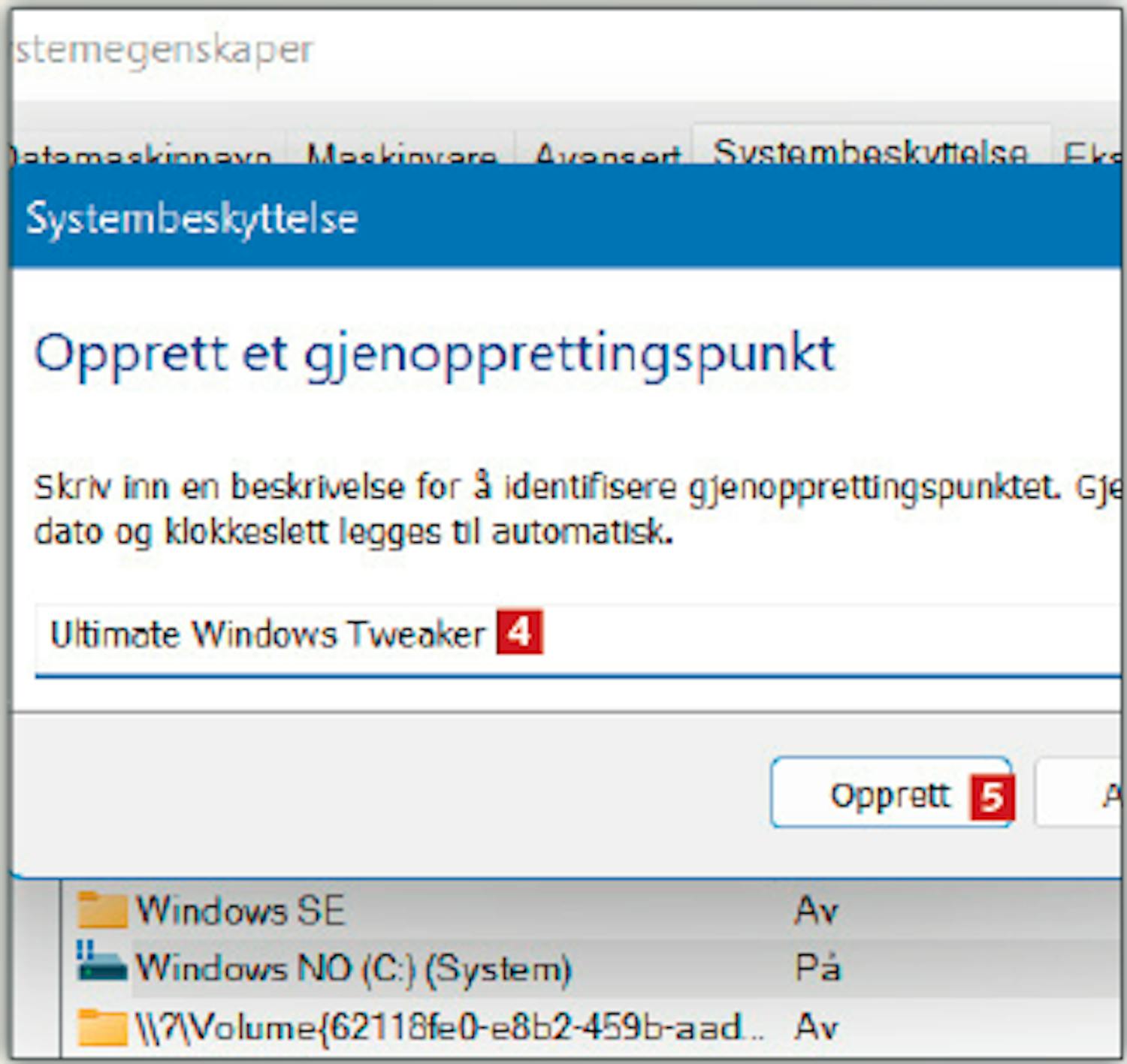 Vi anbefaler at du lager et gjenopprettingspunkt i Windows når Ultimate Windows Tweaker spør deg om det. På den måten kan du gå tilbake hvis du angrer på en innstilling i programmet.