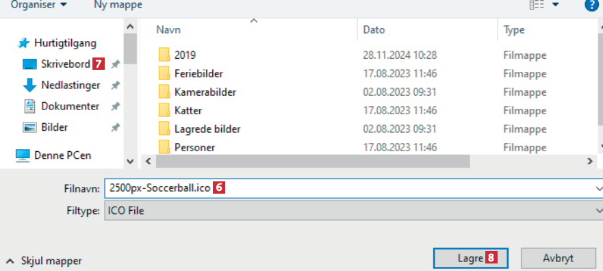 Ikonet får samme navn 6 som det opprinnelige bildet, men med filendelsen .ico. Velg plassering på harddisken 7, og klikk på Lagre 8.