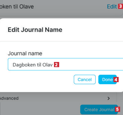 Gi dagboken et navn 2 ved å klikke på Edit 3. Klikk på Done 4 og deretter på Create Journal 5. Nå er dagboken opprettet.
