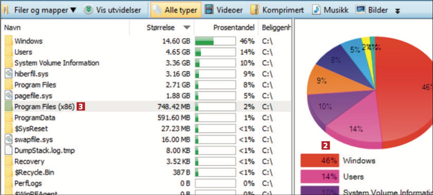Det tar bare et øyeblikk å analysere pc-ens harddisk med verktøyet Glary Disk Explorer. Deretter får du en rask oversikt over fordelingen av filer på pc-en.