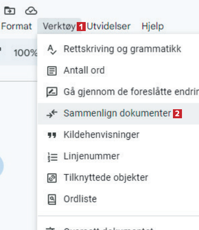Jeg har glemt hvordan man sammenligner to dokumenter i Google Dokumenter. Jeg har lett etter funksjonen på siden docs.google.com, men finner den ikke noe sted.