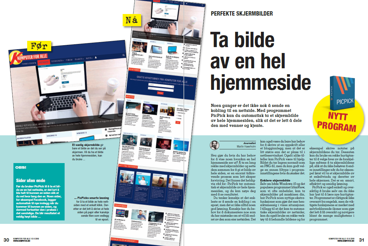 Den kanskje smarteste funksjonen i PicPick er at du kan ta et bilde av en hel nettsiden med et enkelt klikk. Klikke på siden i nettleseren, så tar PicPick et bilde av hjemmesiden fra topp til bunn. Deretter er det lett å skrive ut hele siden på papir eller kanskje sende filen som vedlegg til en epost. Enklere blir det ikke.