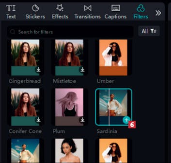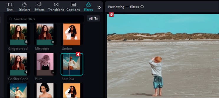 Klikk på et av de mange filtrene i oversikten 4. Når du klikker på et av dem, vil du se en forhåndsvisning i vinduet 5 ved siden av, slik at du får et bedre inntrykk av hva filteret gjør med videofilen.