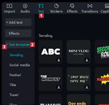 Klikk på Text 1 i verktøylinjen og klikk på Text template 2 på venstre side. Klikk på pilen 3 for å se en oversikt over kategoriene.