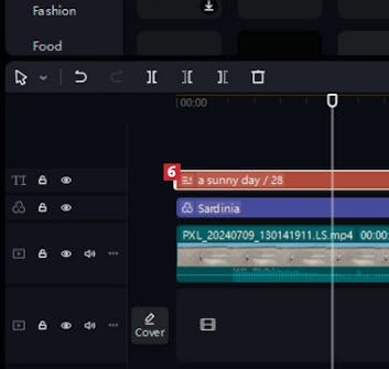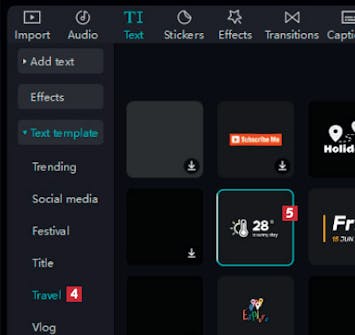 Her klikker vi for eksempel på Travel 4 og velger denne malen 5, som kan brukes til å vise en temperatur, for eksempel i en ferievideo. Dra teksten ned på tidslinjen.
