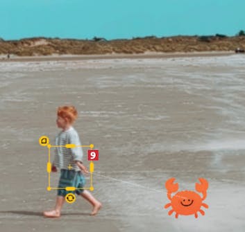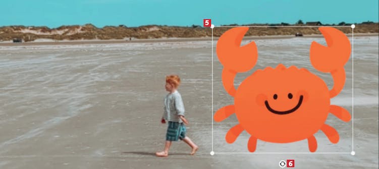 Start med å klikke på krabben og gi den en fornuftig størrelse ved å dra i et av punktene i hjørnene 5. Vil du rotere krabben, gjør du det ved å dra i pilen 6 nederst.