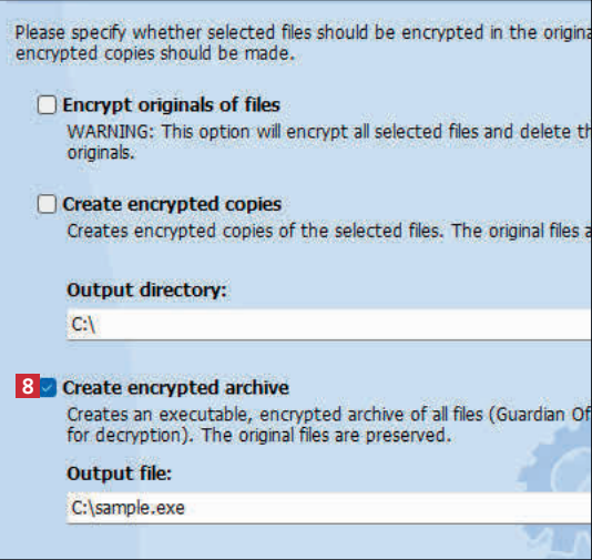 Guardian Of Data kan opprette et selvutpakkende arkiv med de krypterte filene. Det betyr at mottakeren av filene ikke selv må ha programmet for å låse dem opp. I stedet må vedkommende oppgi et passord.
