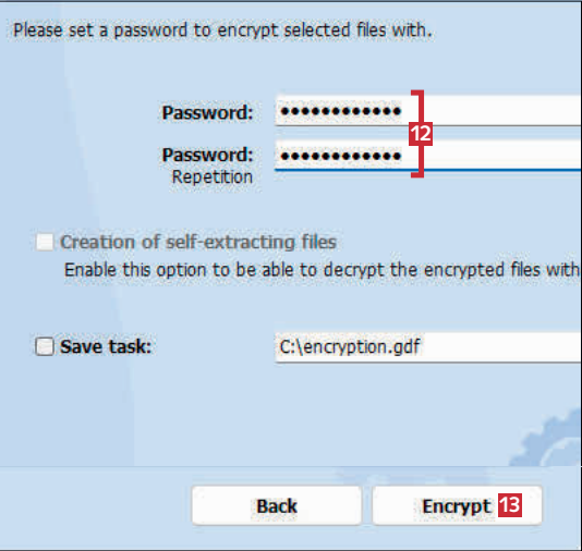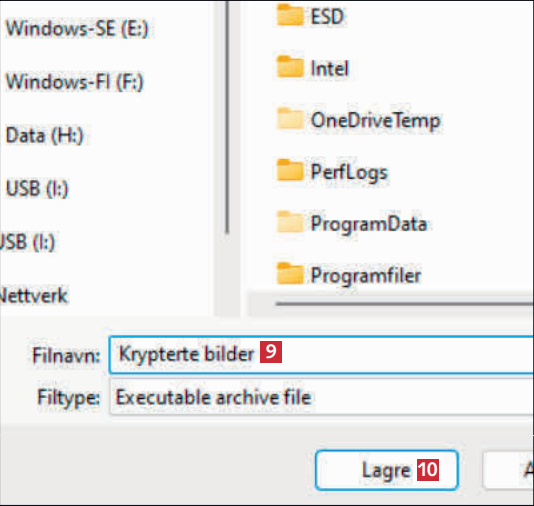 Sett markering ved Create encrypted archive 8, og klikk på mappeikonet for å velge en plassering til den ferdige filen.