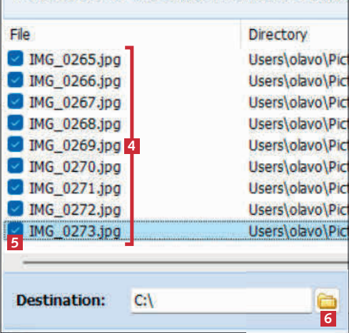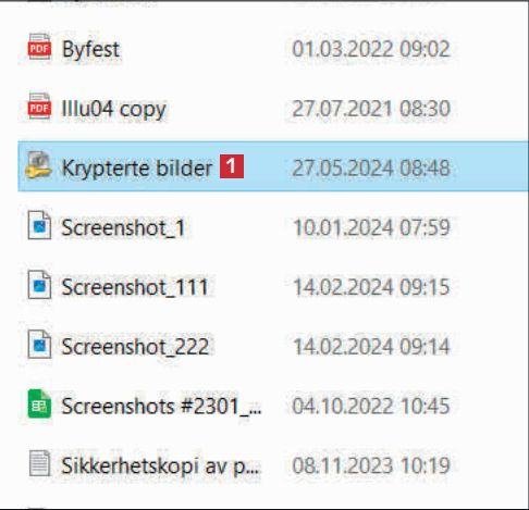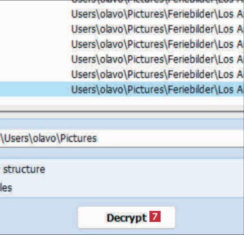 Nå vises filene i den krypterte mappen 4. Sett hake ved filene du vil dekryptere 5. Klikk på mappeikonet 6, og velg mappen filene skal lagres i.