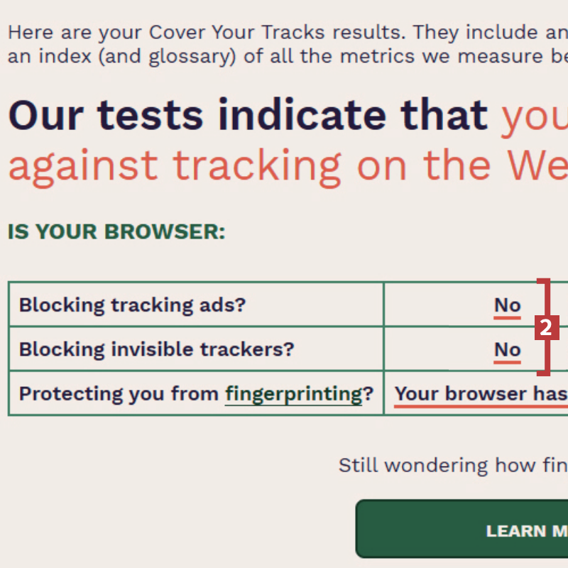 Åpne først nettleseren og gå deretter til nettsiden coveryourtracks.eff.org – der du klikker på TEST YOUR BROWSER 1.
