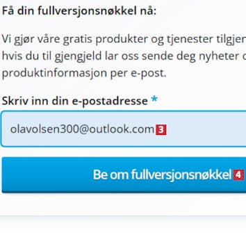 Oppgi e-postadresse 3, og klikk på Be om fullversjonsnøkkel 4. Hvis du allerede har konto hos Ashampoo, blir du bedt om å logge på med passord.