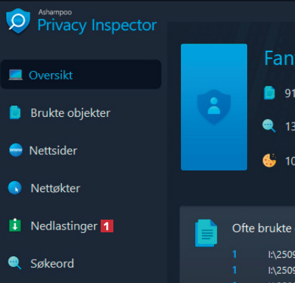 Øverst i vinduet får du en praktisk oppsummering av personvernrelaterte spor som ble funnet på pc-en. Herfra kan du klikke deg rett inn på de enkelte punktene.
