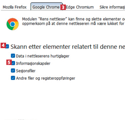Her kan du velge innstillinger for hver nettleser, som Chrome 3. Du kan slette alle lagrede data 4, eller beholde for eksempel informasjonskapsler 5. Klikk på OK.