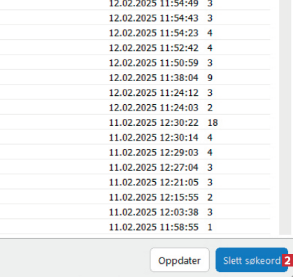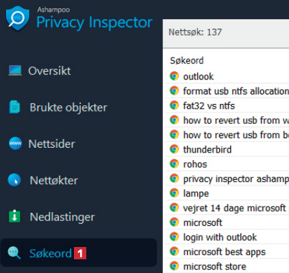 Her ser du alle ordene du har søkt etter på nettet. Søkeord kan være svært avslørende, men også her kan du ganske enkelt slette informasjonen med et klikk på kosten.